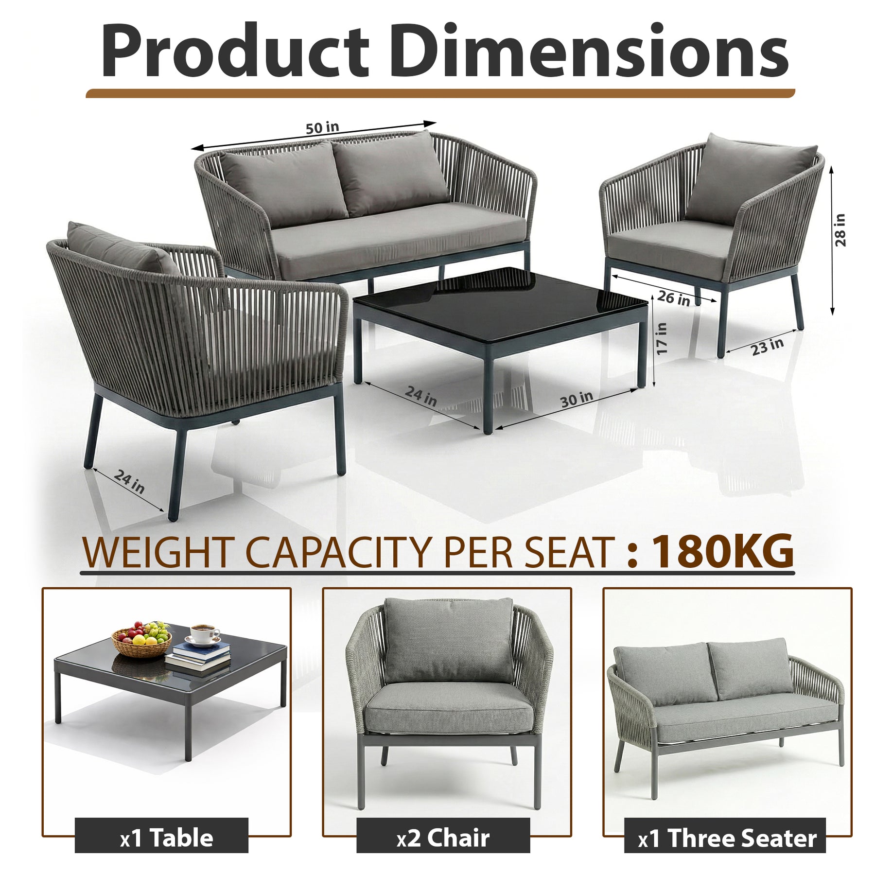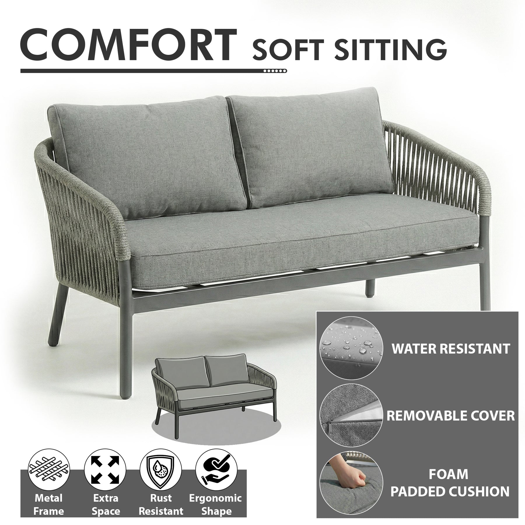 Relax in comfort and style with our Iconic sofa set. This Elegant sofa set is manufactured with style and comfort in mind. When searching for convenient outdoor furniture for any space, this sofa set won’t let you down. This garden set will fit on most balconies, giving a beautiful look.