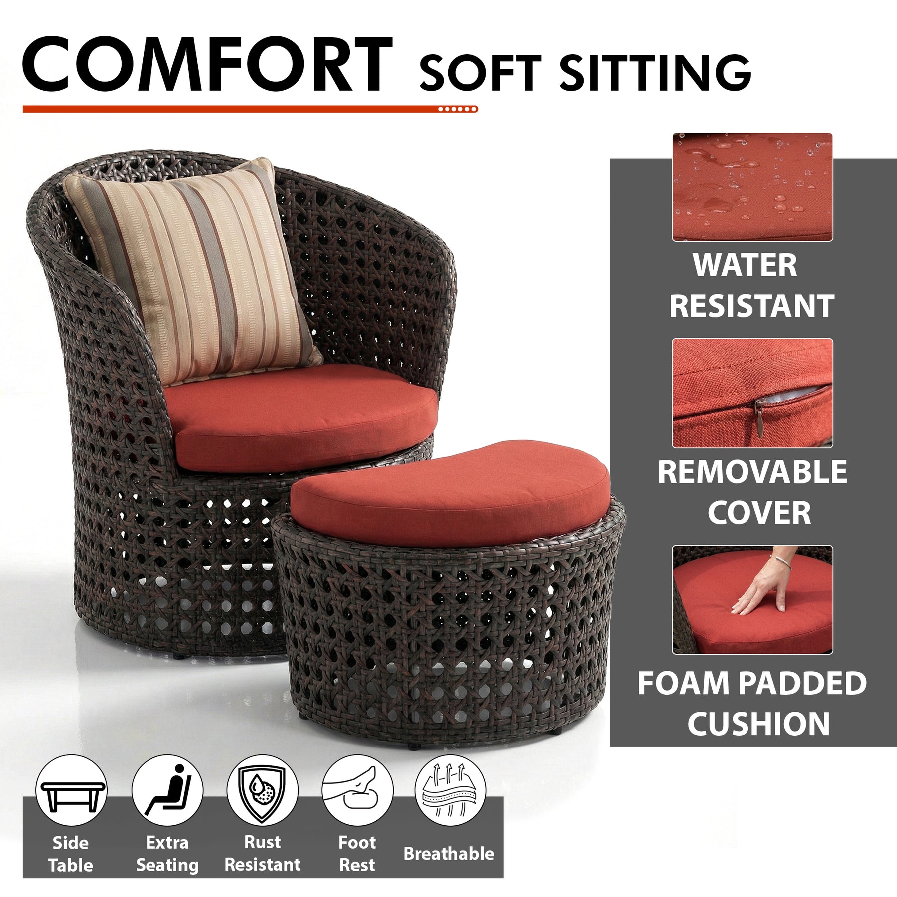 Relax in comfort and style with our Iconic sofa set. This funky sofa set is manufactured with style and comfort in mind. When searching for convenient outdoor furniture for any space, this sofa set won’t let you down. This garden set will fit in most balconies, giving a beautiful look.