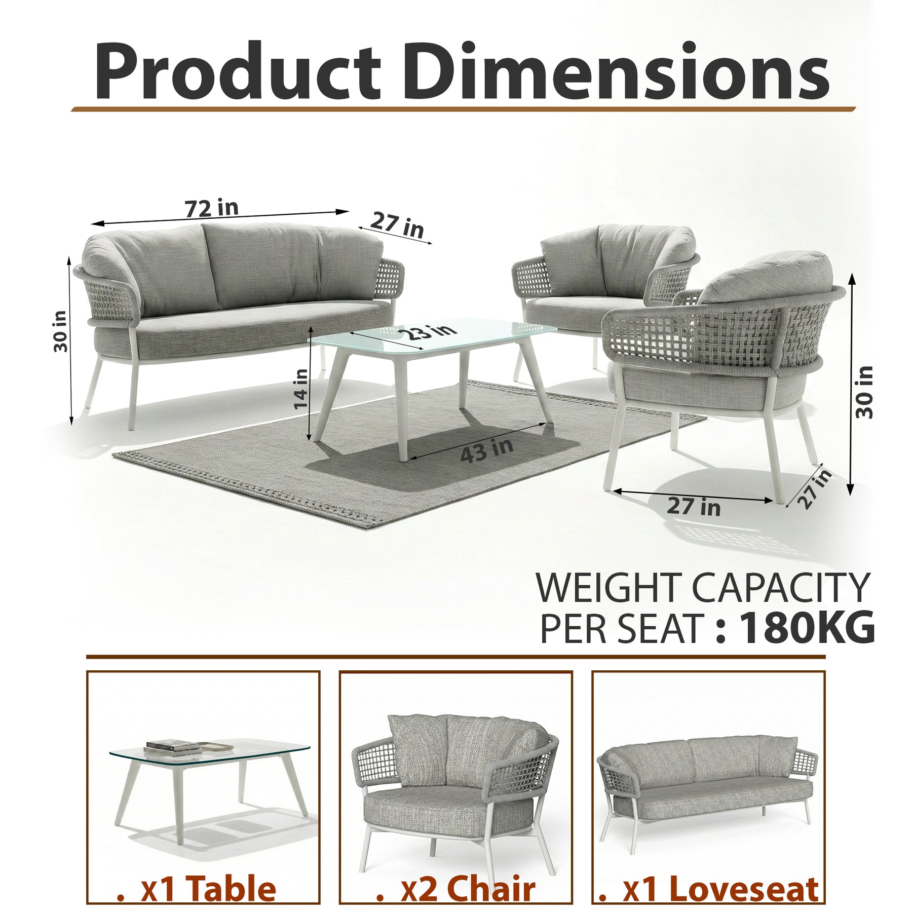 Single Seat: Width 27 inch, D 27 inch, Height 30 inch